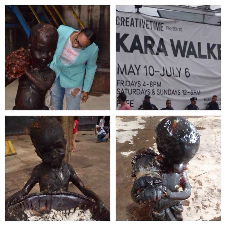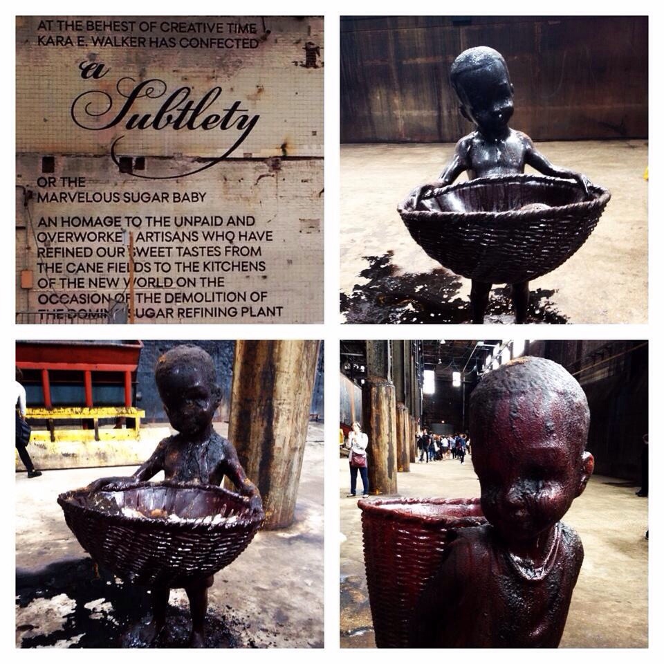 We walked into the Domino Refinery Factory excited to view the exhibit created by renowned artist Kara E. Walker. We were gobsmacked when we spotted the first male of molasses coloring titled “Sugar Babies”. They were standing there coated with the thick, dark brown syrup obtained from raw sugar during the refining process. Each one I wanted to lick and take a bite as the song Brown Sugar played in my head. “You know I read that sugar in its normal state is not white!”
