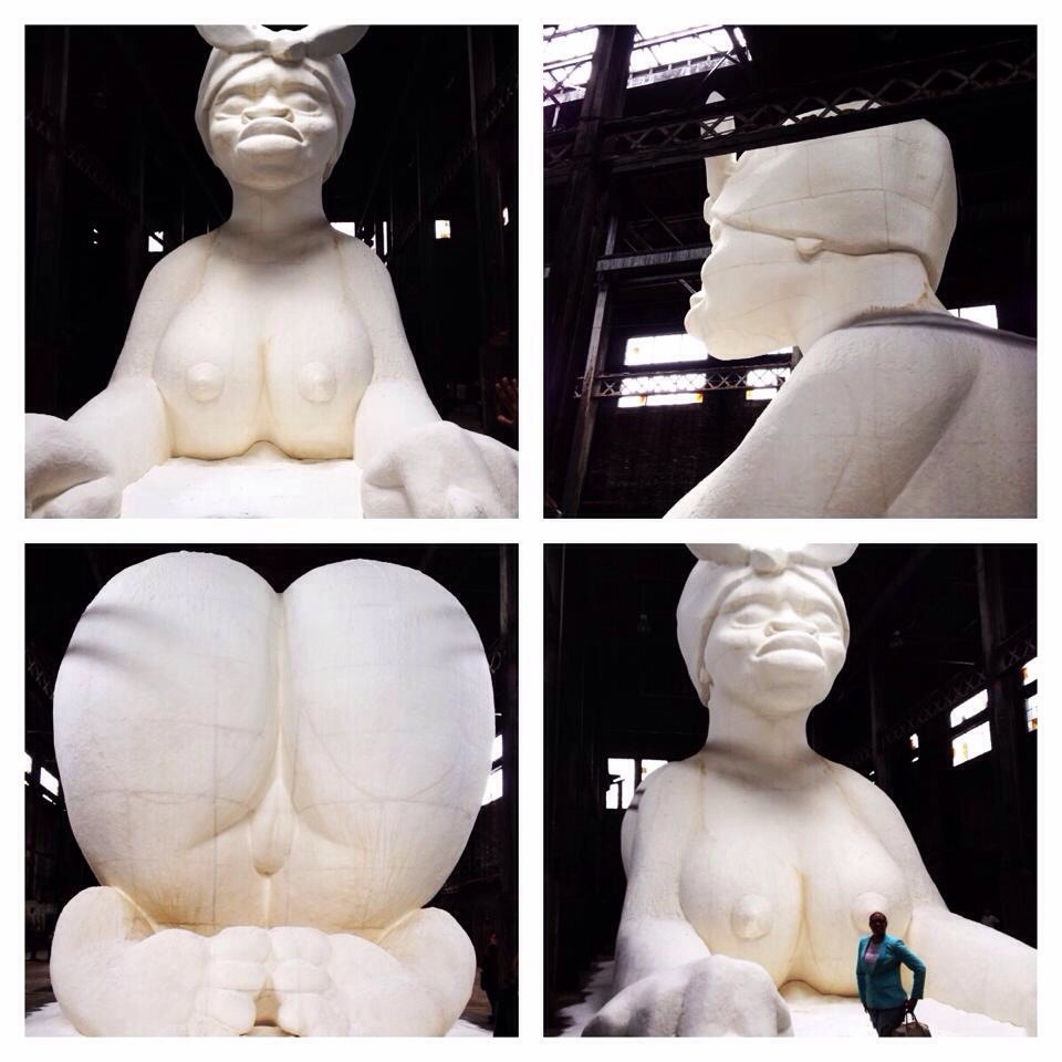 But, then a silent face of the sphinx that I saw online grabbed my attention. A kneeling nude polystyrene white woman with African features, posed to resemble a 35 foot sphinx encrusted with sugar the title of this exhibit is “Subtlety”. Splitting up to embrace our own zone I took a turn to the back. A small detail that is usually important but not obvious. The back was cunning. Hot Dam! Ain’t nothing better than sweet sugar!