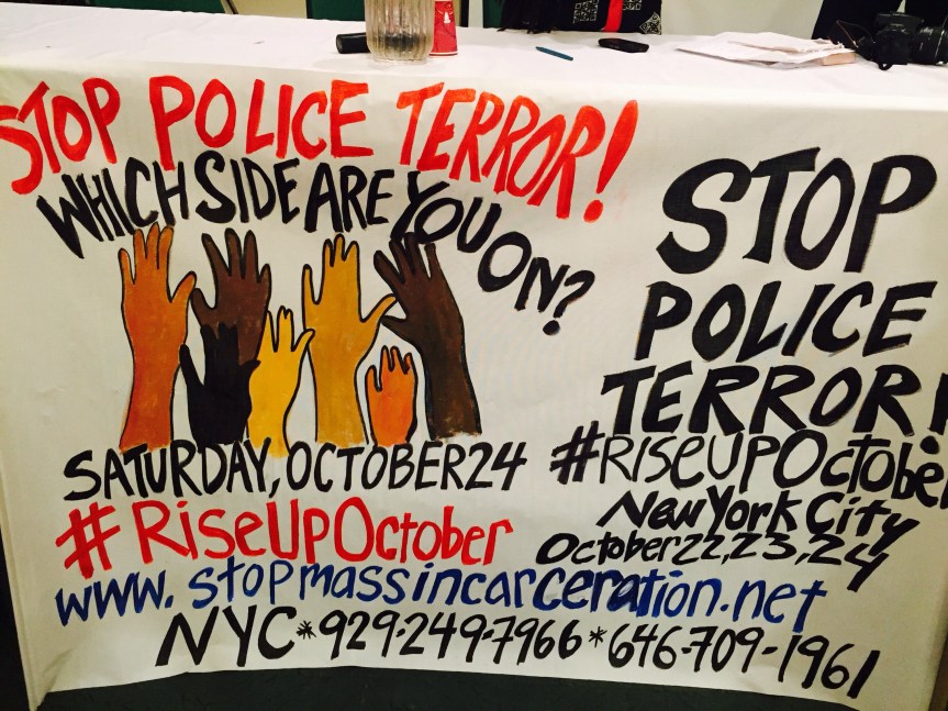 Carl Dix also stood in this room packed with individuals from various organizations in New York: Revolution Newspaper, People’s Power Assemblies, Artist for Justice, and Mothers Against Youth Geniside”.