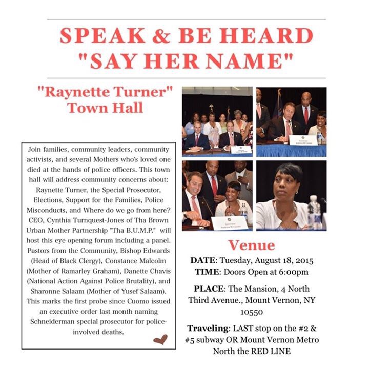 “Speak & Be Heard” was planned in seven days. You see, Raynette was one of the five Black woman who died in Police custody within a two week period. Sandra Bland July 10th, Kindra Chapman July 14th, Joyce Curnell July 22, Ralkina Jones July 26th, and Raynette Turner July 27th. The evening of Raynette Turner’s wake was the birth of the idea to say something. The rationale was because the street in front of the church was alarmingly poor in attendance. We stood in Union Square for Sandra Bland and the attendance was filled with individuals who are tormented and haunted by the plethora of cases with the same outcomes. This is when we realized that social media built Sandra Bland’s awareness to the masses. We all agreed that Raynette Turner must also be heard. In addition, we also knew that Raynette Turner will be the first to benefit from the Gov. Andrew M. Cuomo signing an executive order designating the state attorney general, Eric T. Schneiderman, as a special prosecutor for certain police-related civilian deaths. The order came amid vociferous calls for police reform from several families of New Yorkers who died at the hands of police officers.