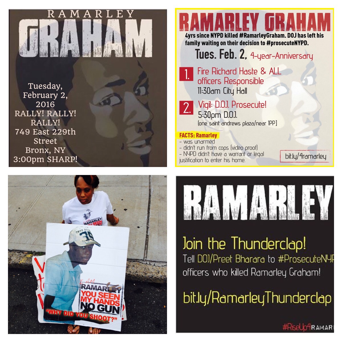 Today, February 2, 2016 marks year four. The Department of Justice has left the family of Ramarley Graham hanging. NO DECISION made in four years to prosecute NYPD. The crowd was reminded that Ramarley Graham was: 1. Unarmed 2. Did not run from the cops (video proof) 3. NYPD did not have a warrant or probable cause to enter his home.