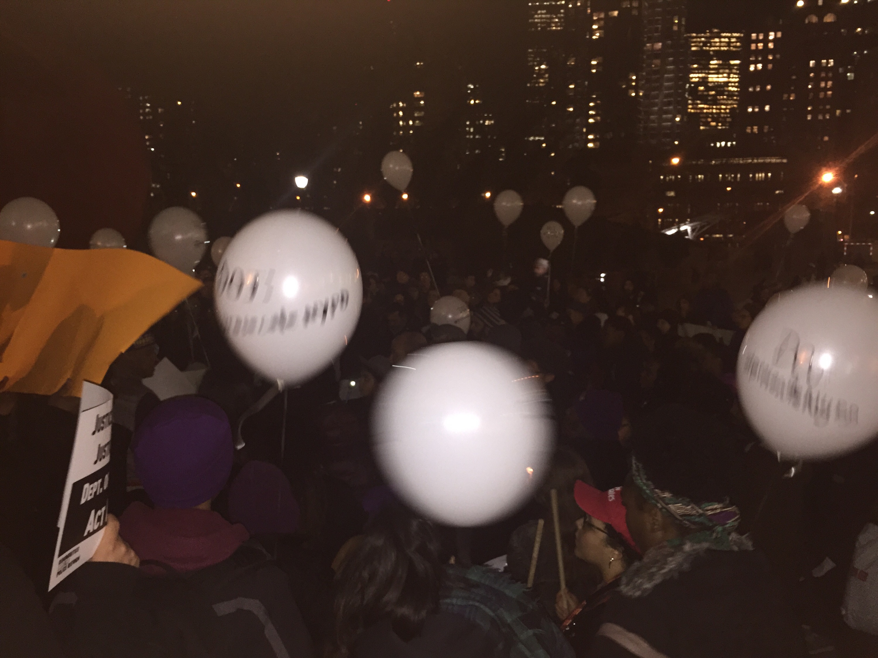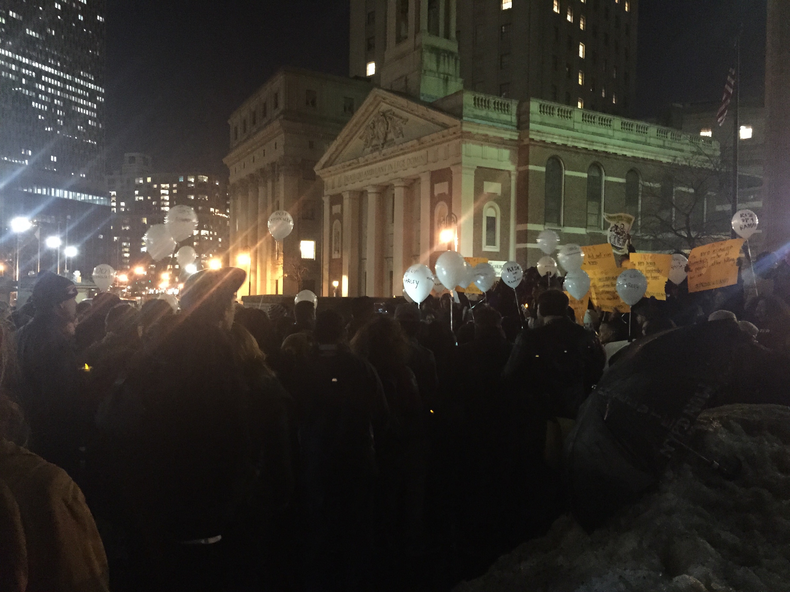 Business suits with brief cases. Officers in blue. Walking in unison. One Saint Andrew Plaza home of the Department of Justice. It is now five fifteen and the after work buzz is in the air. Balloons. Cameras. Lights. Coffin. Chants. “We stand hand and hand with Ramarley Graham. We stand hand and hand with Ramarley Graham.”