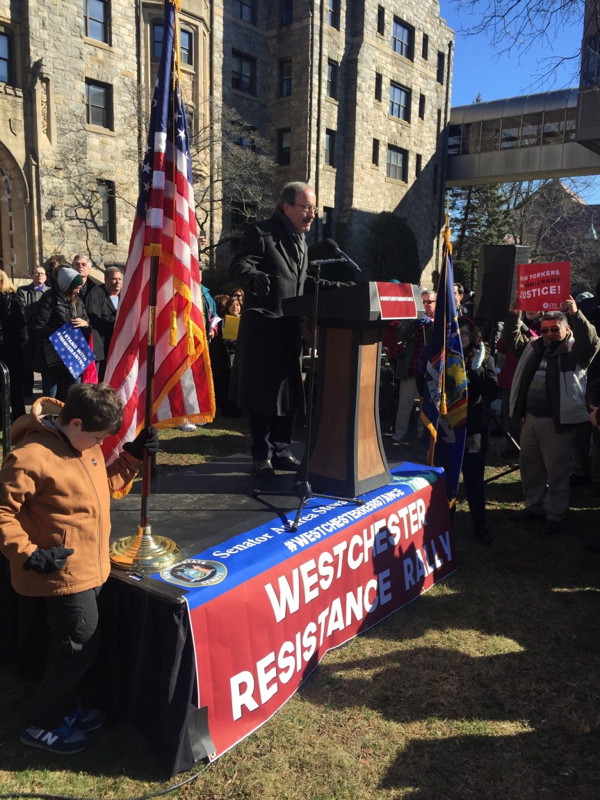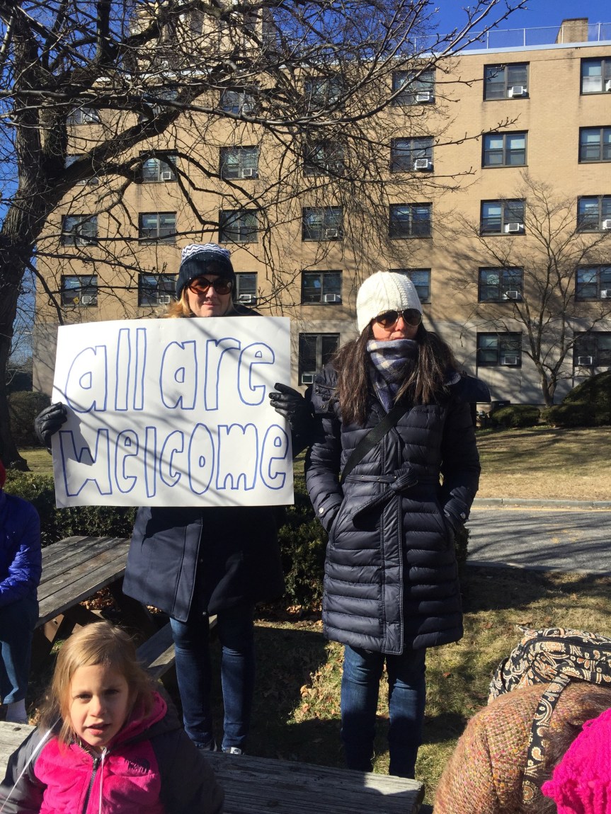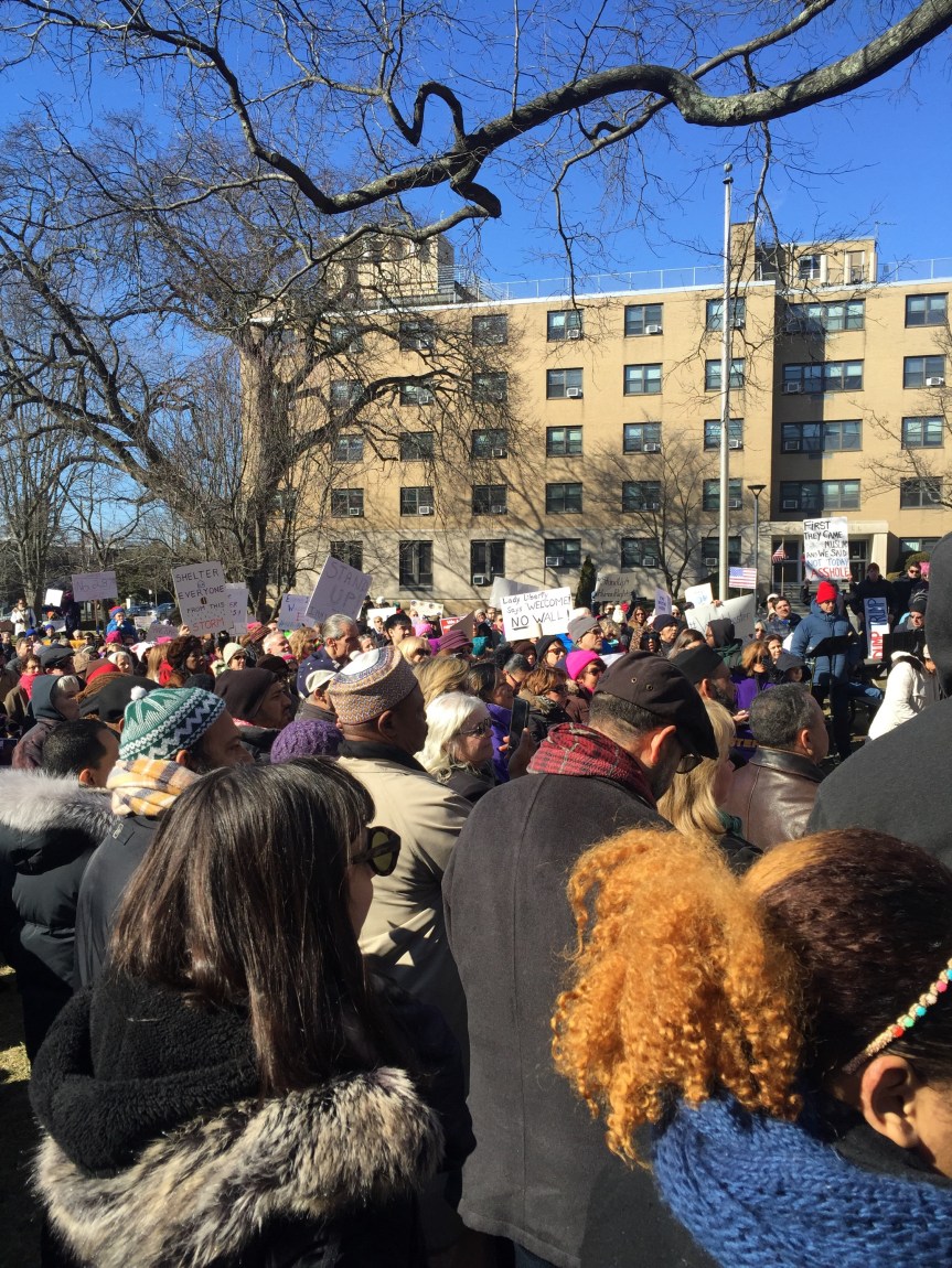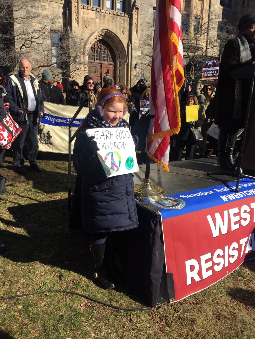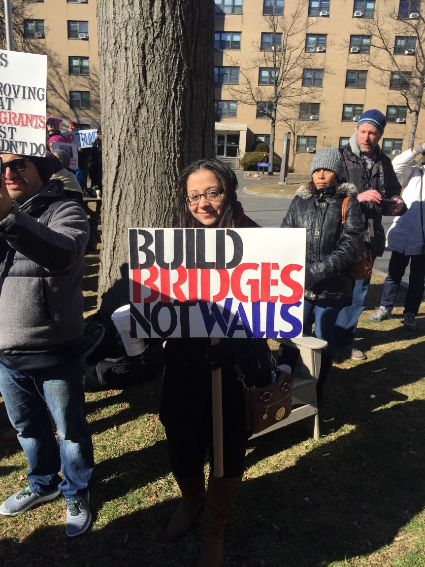 We stood beside one another on a cold Saturday afternoon with the sun warming us in-between chants and signs waving. “Resist. Unite. We will win this fight!” Residents of Westchester County joined to rally for immigrants. It was the third Saturday in a row since Trump’s inauguration that protesters flooded streets, public parks and plazas to express displeasure with the new president’s agenda.