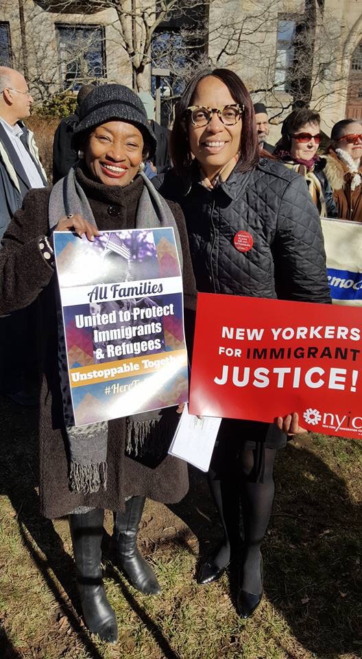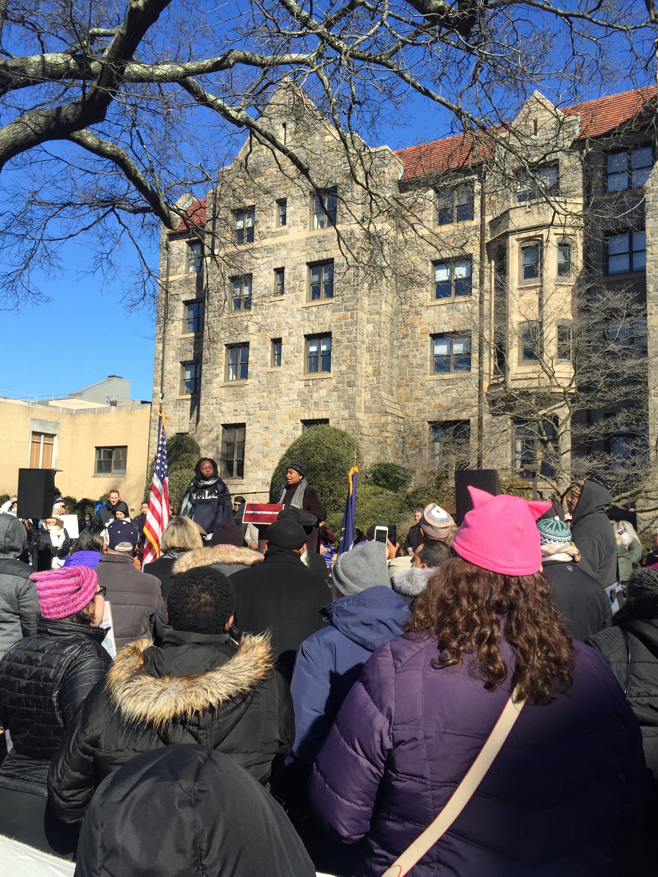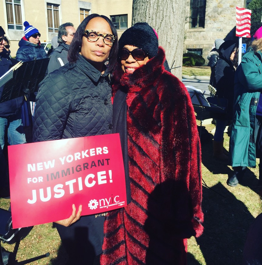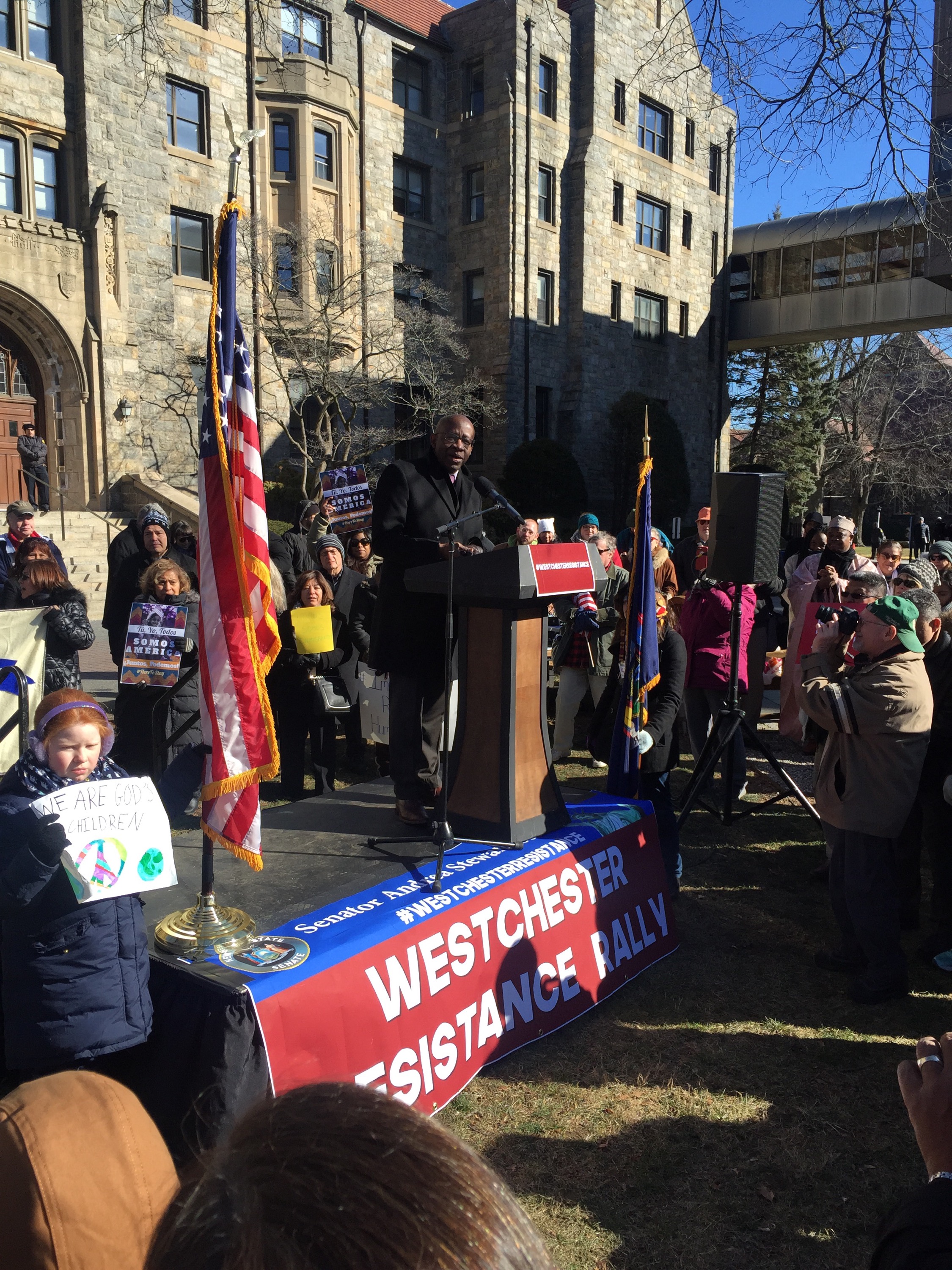 “There is still more to do”, said Andrea Stewart Cousins as the crowd cheered. She is a New York State Senator and the first woman in New York State history to lead a conference in Albany. The Yonkers resident represents the 35th State Senate district in New York which in its present configuration includes Ardsley, Dobbs Ferry, Elmsford, Greenburgh, Hastings-on-Hudson, Irvington, Tarrytown, Scarsdale and parts of Yonkers, White Plains, and New Rochelle. Senator Andrea Stewart-Cousin hosted a well attended event. Westchester Resistant Rally for Immigrants on the lawn of Pace Law School will never be forgotten. Signs welcoming all and sprinkles of pink hats indicating that those wearing them either went to the Women’s March or is in solidarity with the Women who marched. #thabump #supportimmigrants #makeamericagreat With ❤️ Cynthia