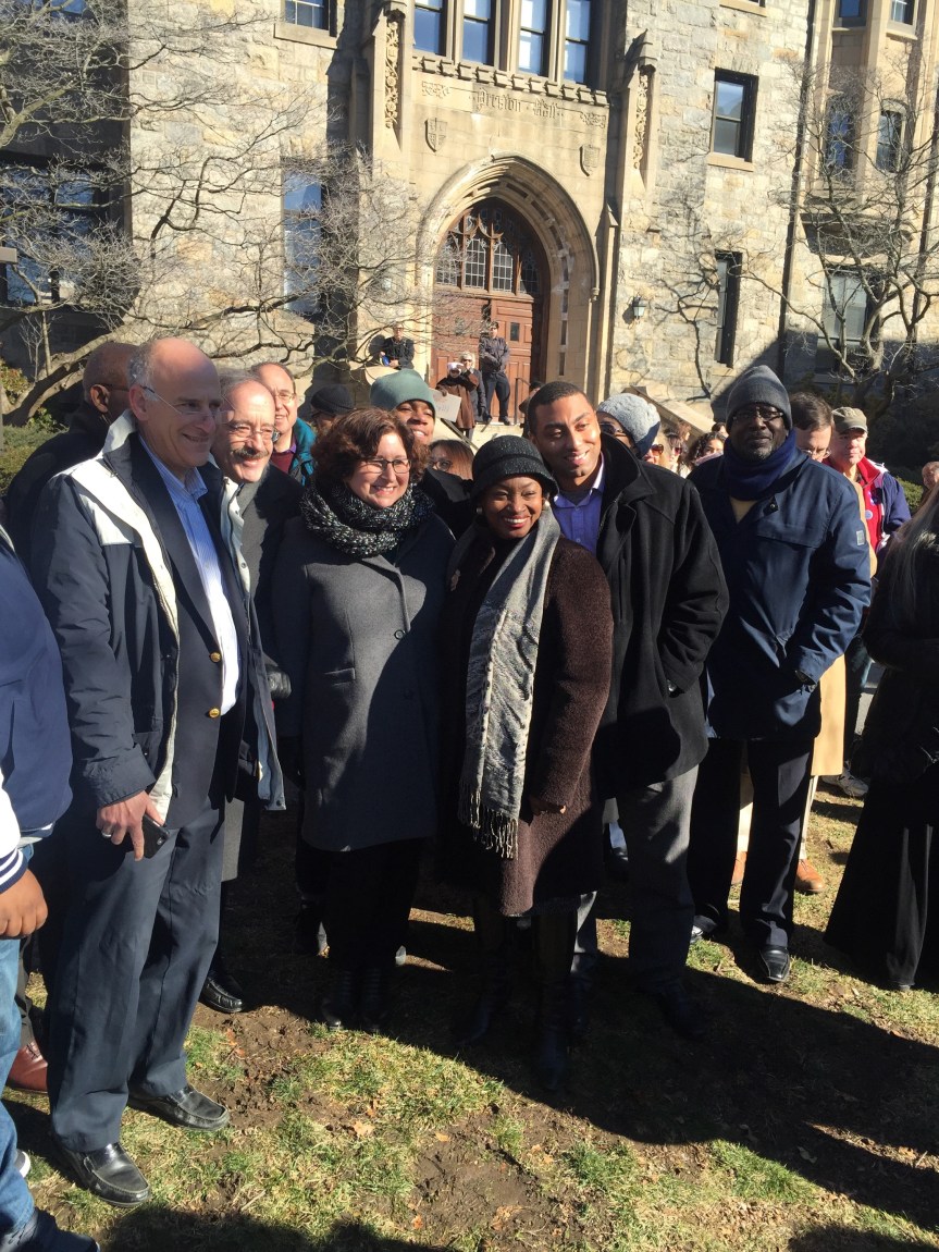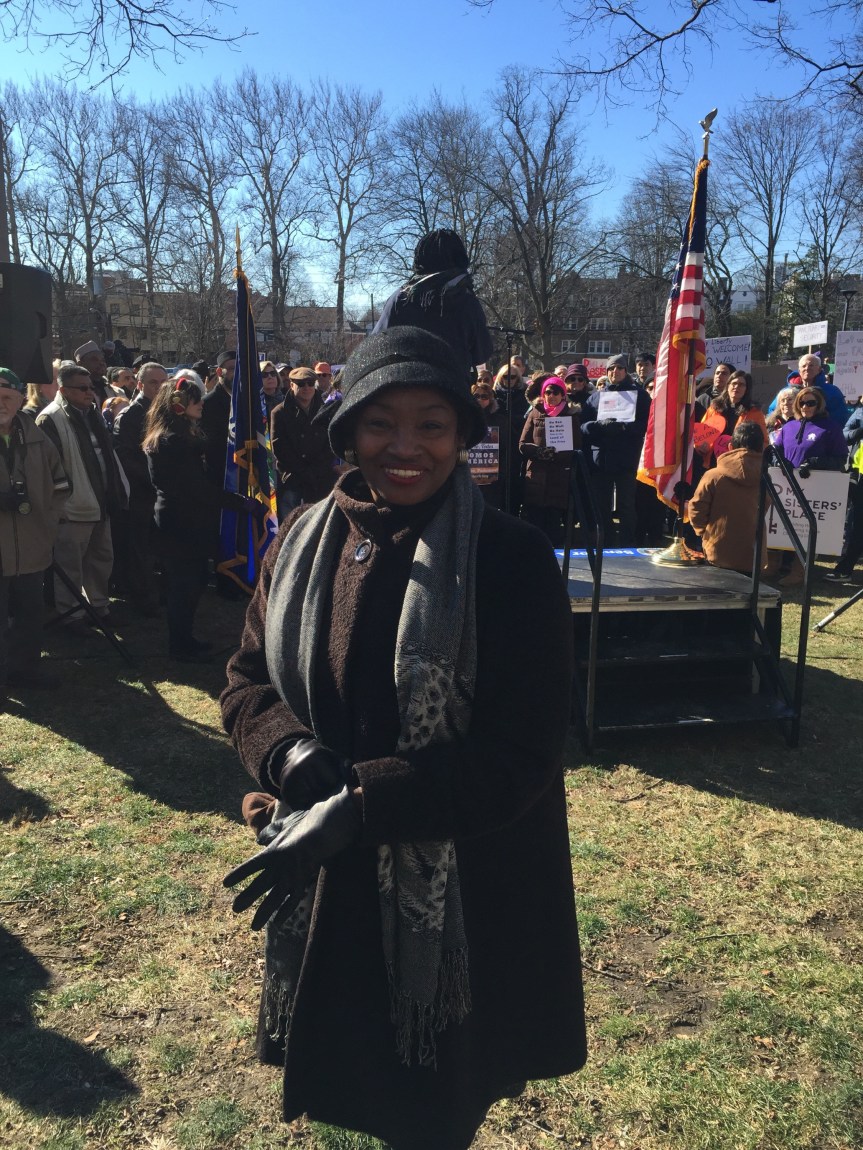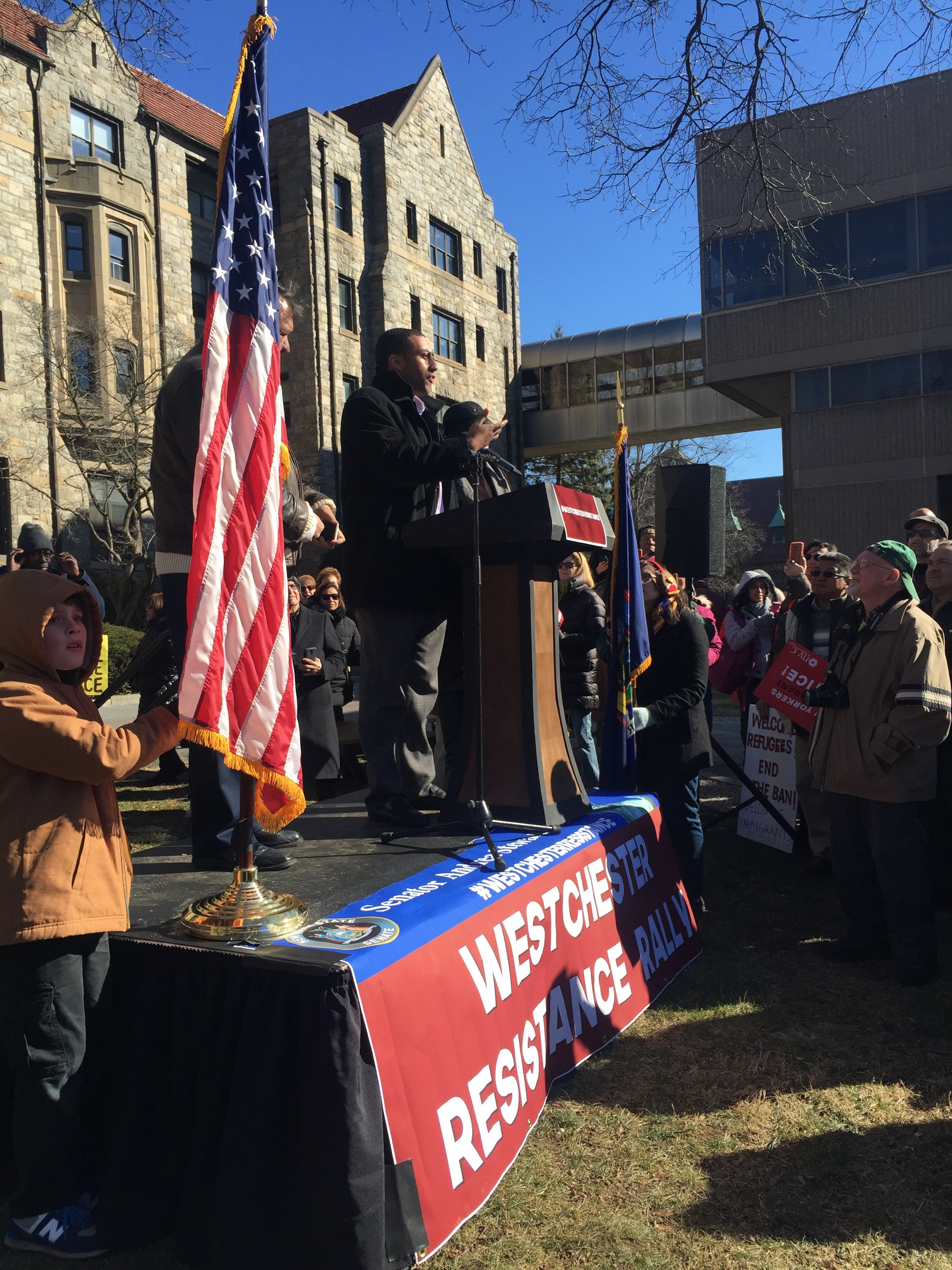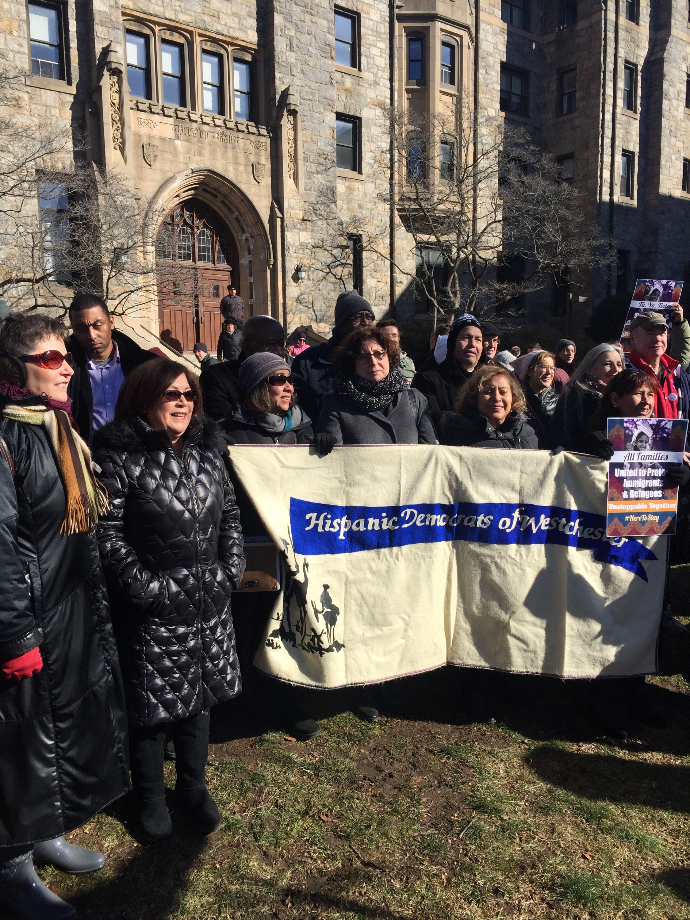 “There is still more to do”, said Andrea Stewart Cousins as the crowd cheered. She is a New York State Senator and the first woman in New York State history to lead a conference in Albany. The Yonkers resident represents the 35th State Senate district in New York which in its present configuration includes Ardsley, Dobbs Ferry, Elmsford, Greenburgh, Hastings-on-Hudson, Irvington, Tarrytown, Scarsdale and parts of Yonkers, White Plains, and New Rochelle. Senator Andrea Stewart-Cousin hosted a well attended event. Westchester Resistant Rally for Immigrants on the lawn of Pace Law School will never be forgotten. Signs welcoming all and sprinkles of pink hats indicating that those wearing them either went to the Women’s March or is in solidarity with the Women who marched. #thabump #supportimmigrants #makeamericagreat With ❤️ Cynthia