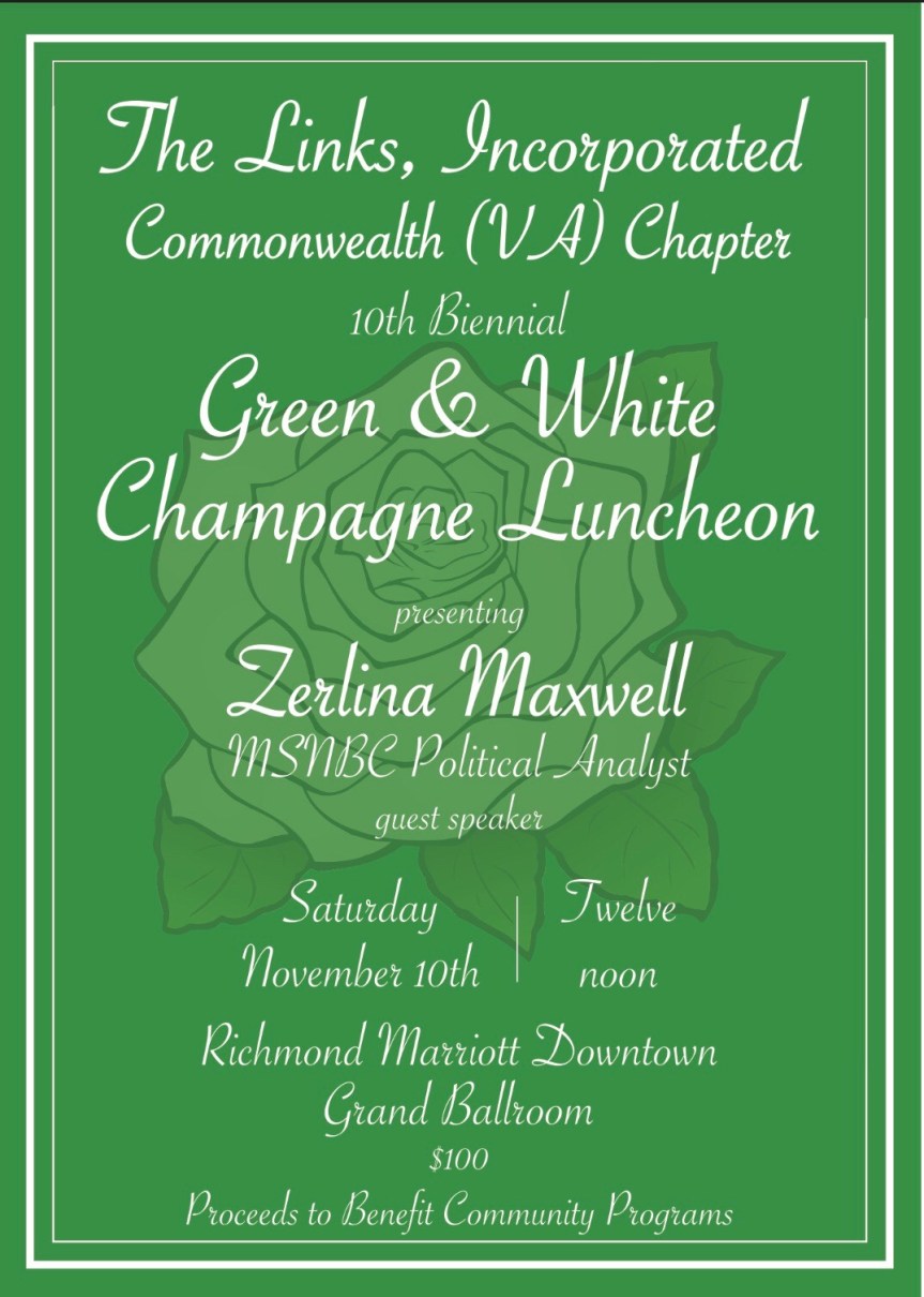 The Links, Incorporated Commonwealth Virginia Chapter 10th Biennial Green & White Champagne Luncheon. Present was Zerlina Maxwell an American political analyst, commentator, speaker, and writer. She writes and speaks about rape culture, sexual assault, gender inequity, sexual consent, racism, and similar topics. She is herself a survivor of sexual assault and describes herself as a survivor activist. The MSNBC Political Analyst who quoted Rosa Parks, “I would rather be lynched than live to be mistreated and not be allowed to say ‘I don’t like it.’ ” She spoke of the future and our voice the champion for change.