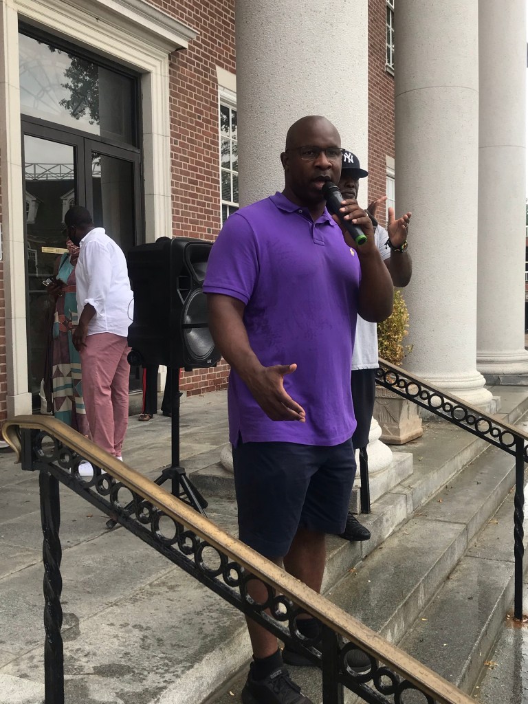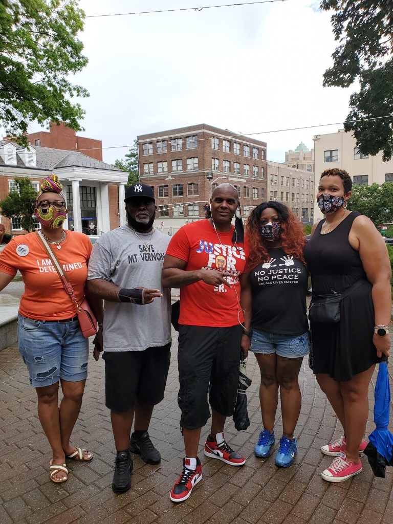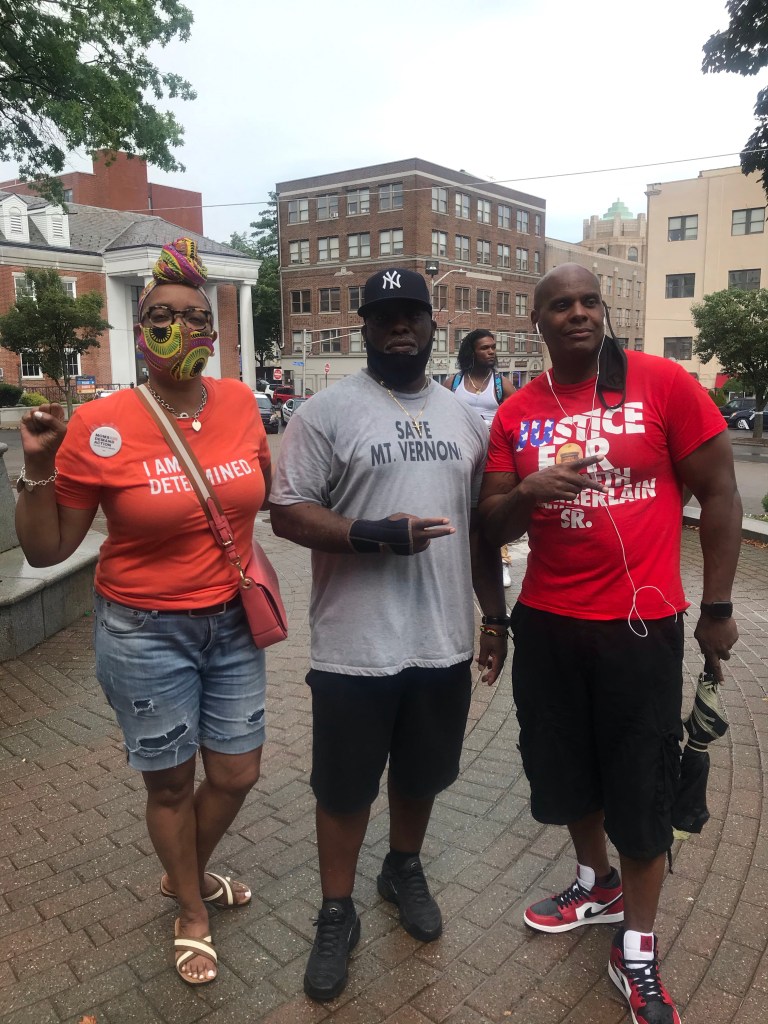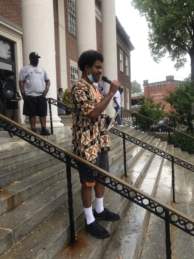 City Hall is located across from the Mount Vernon Police station. This gave those frustrated the ability to speak out for justice. Voices of many were heard. Jamaal Bowman former middle school principal who unseated Eliot Engel in New York was present. He stood in the rain addressing what it feels like to be afraid of police officers at the age of 11 years old.
