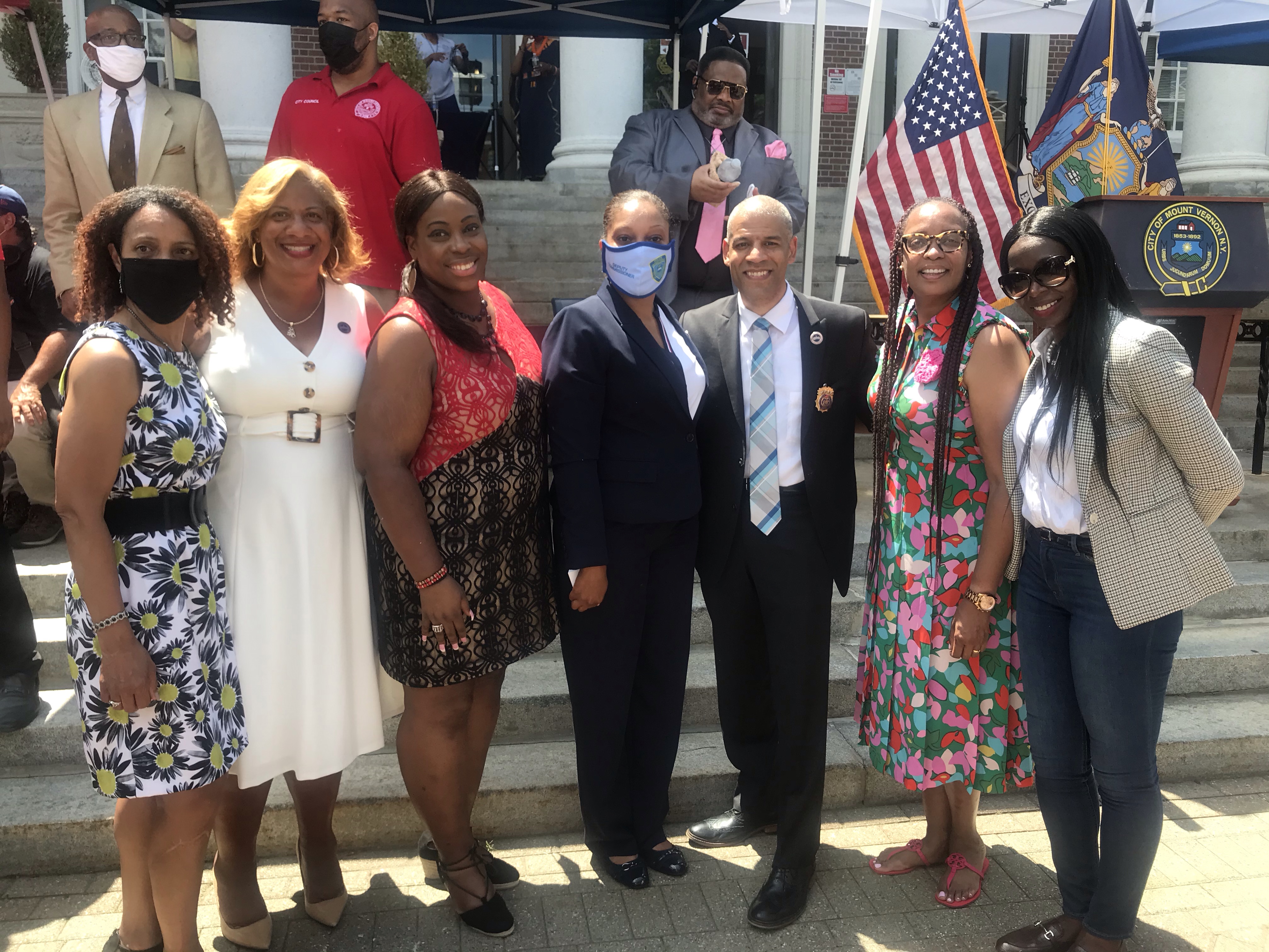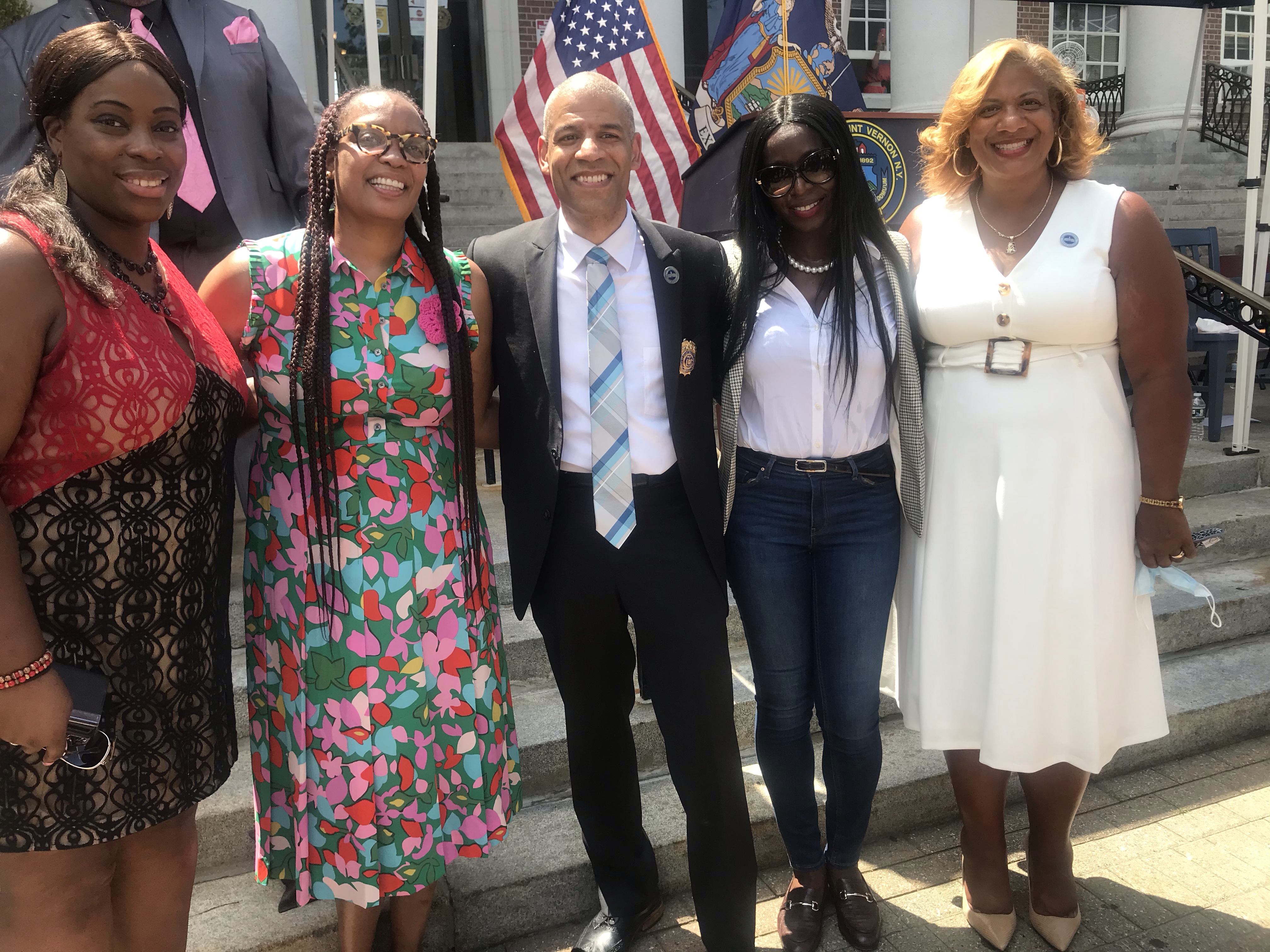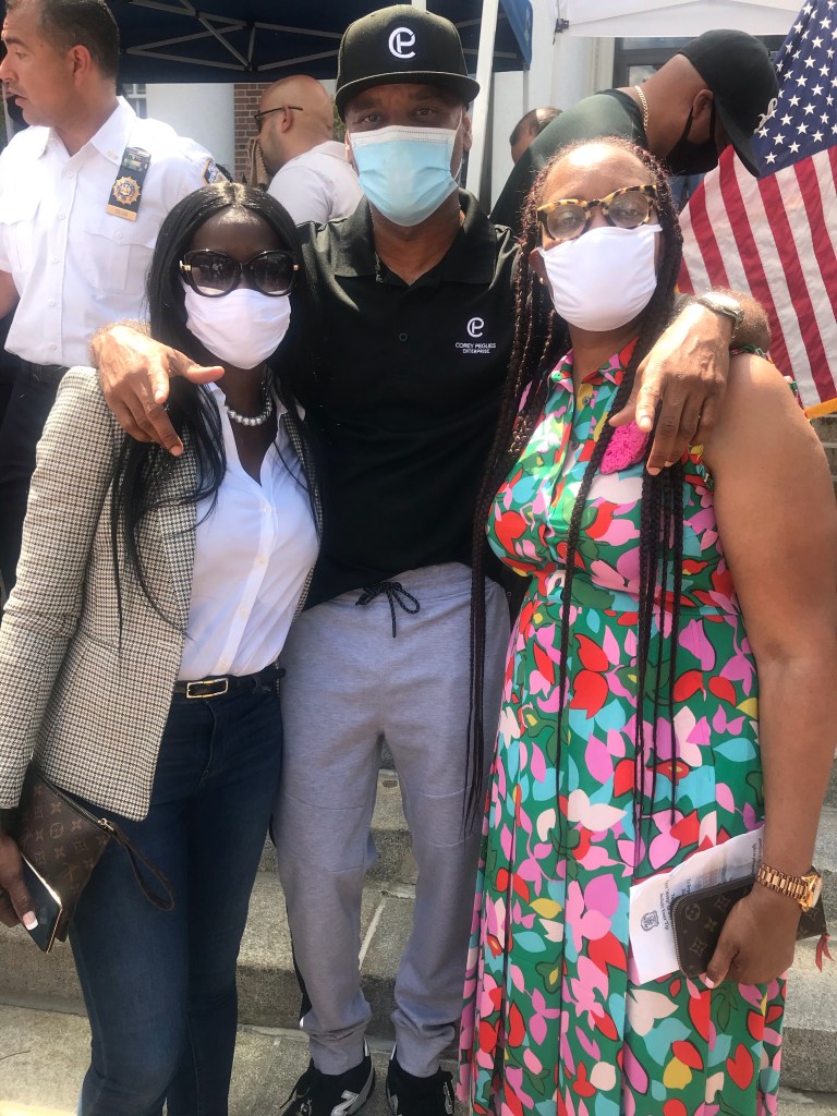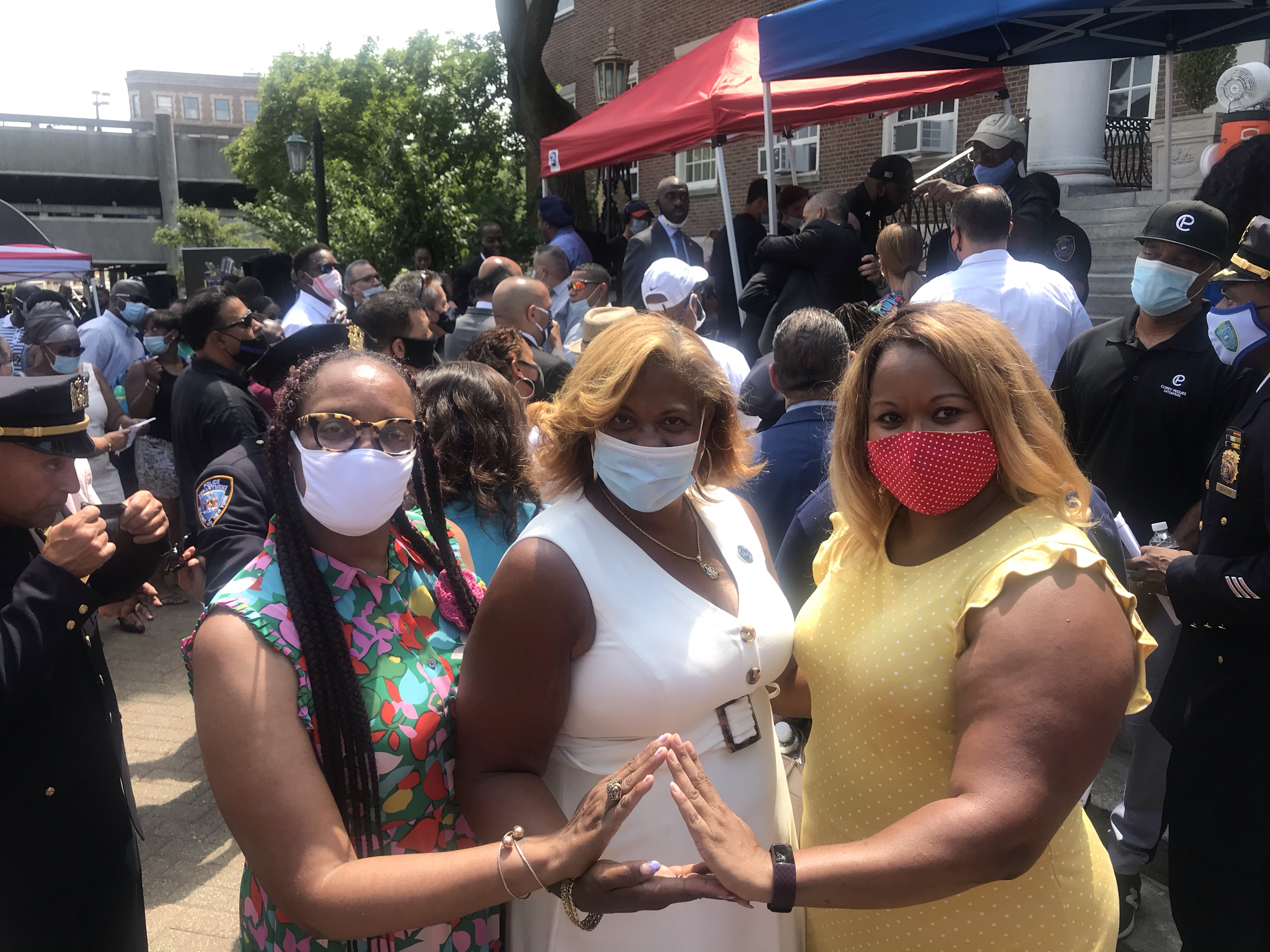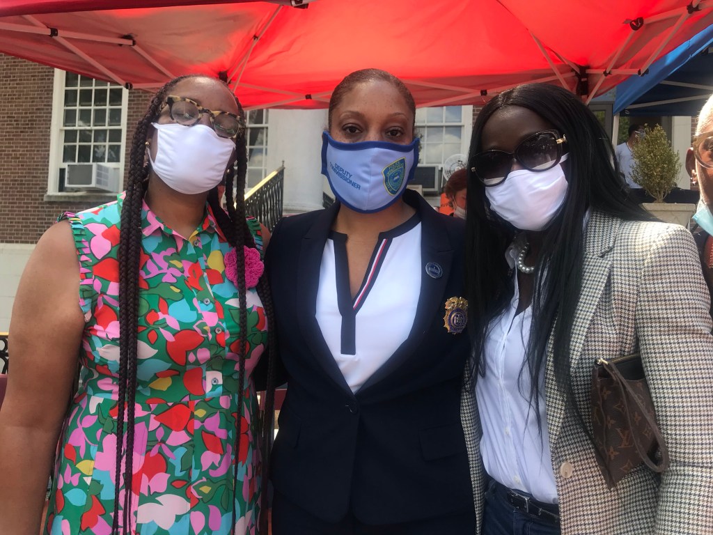 Cynthia Turnquest-Jones, Tha BUMP [left] Priscilla Echi, Social Butterfly [right] congratulates Jennifer Lackard [middle] who was sworn in as Deputy Police Commisioner of Special Initiatives in Mount Vernon, New York today July 21, 2020.