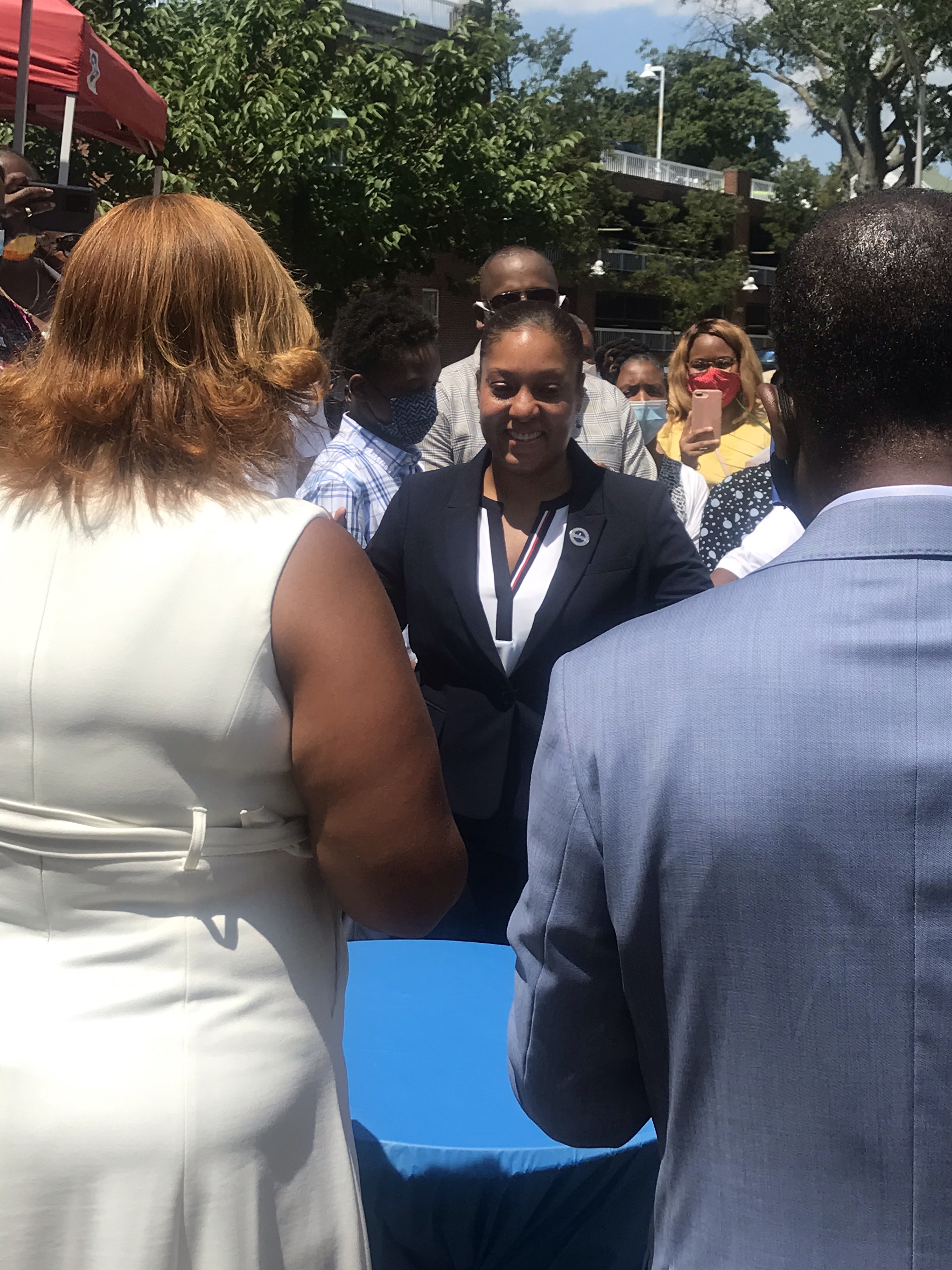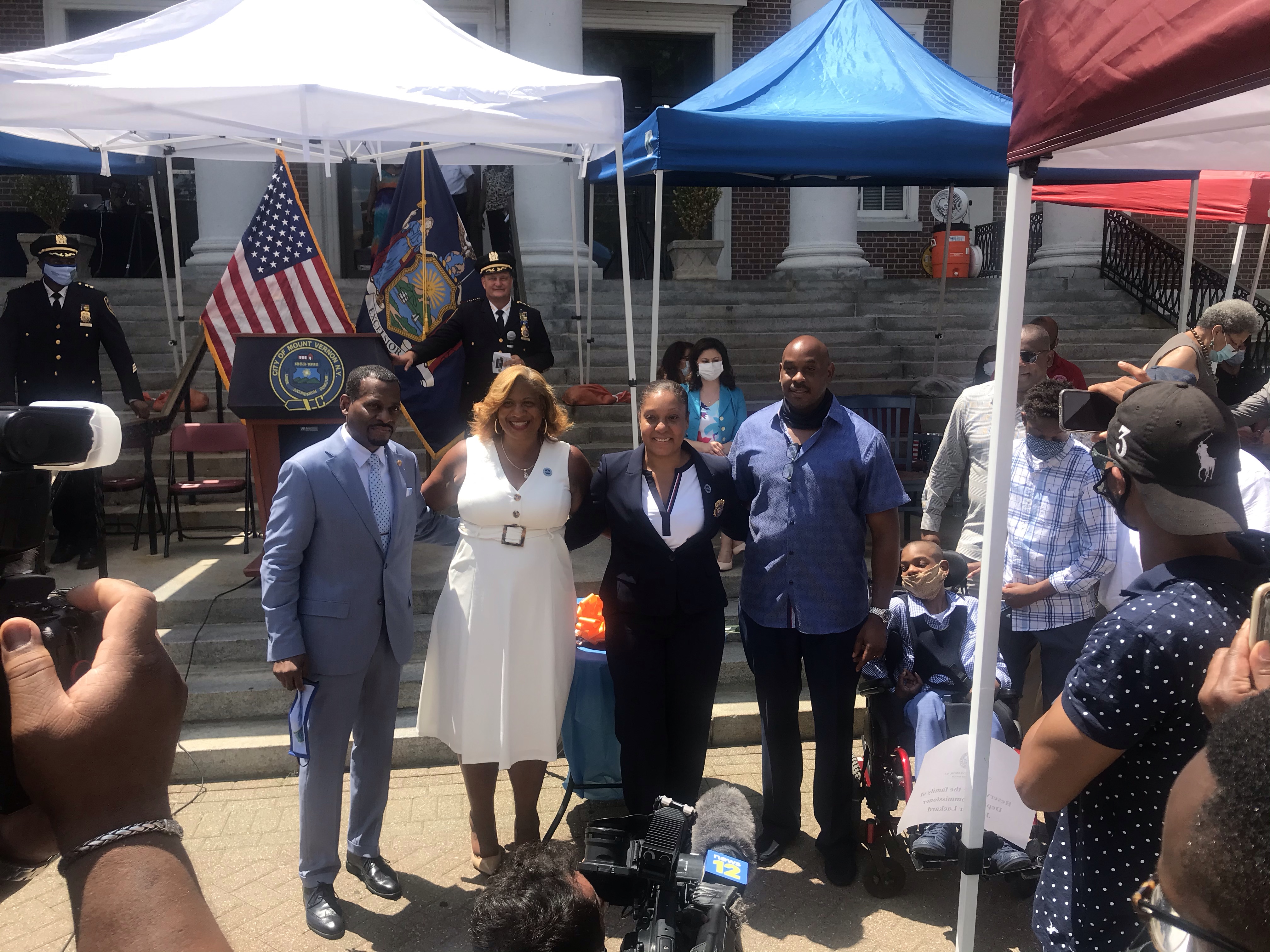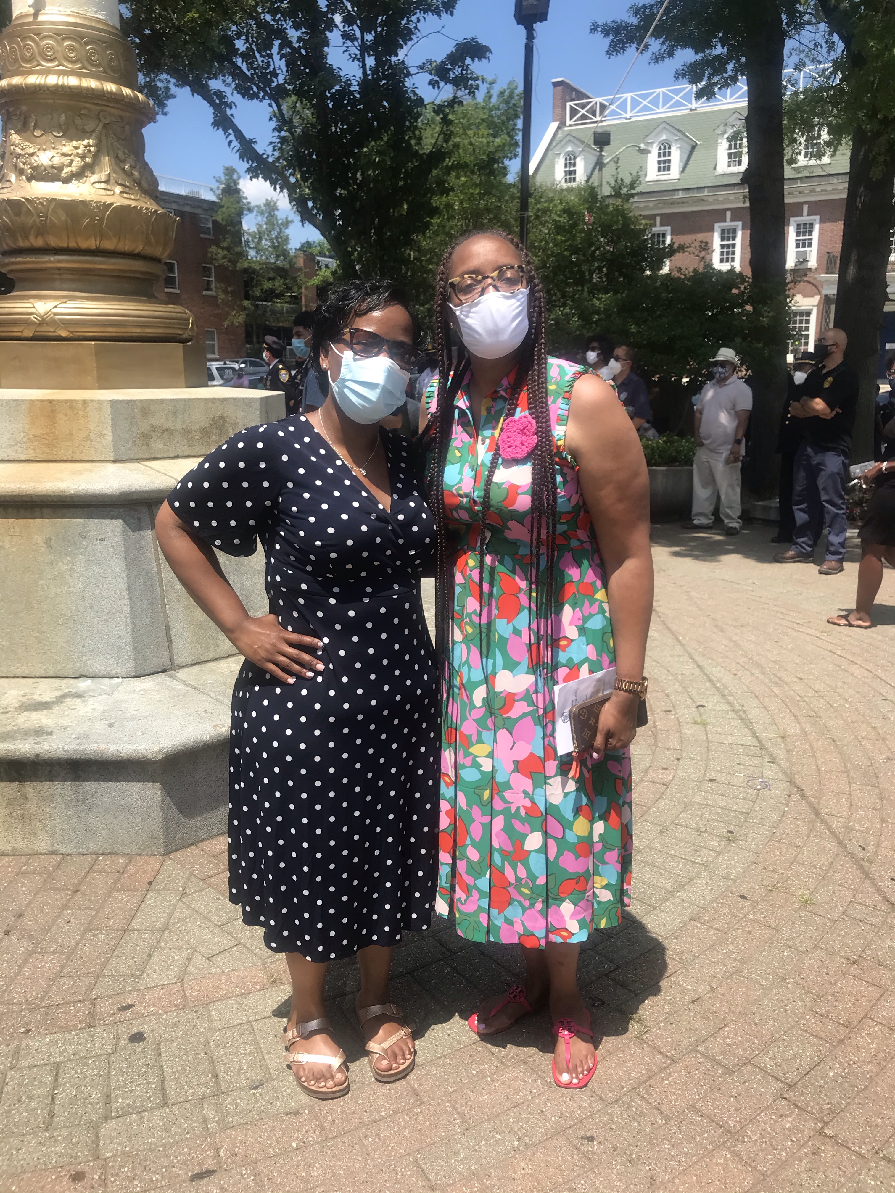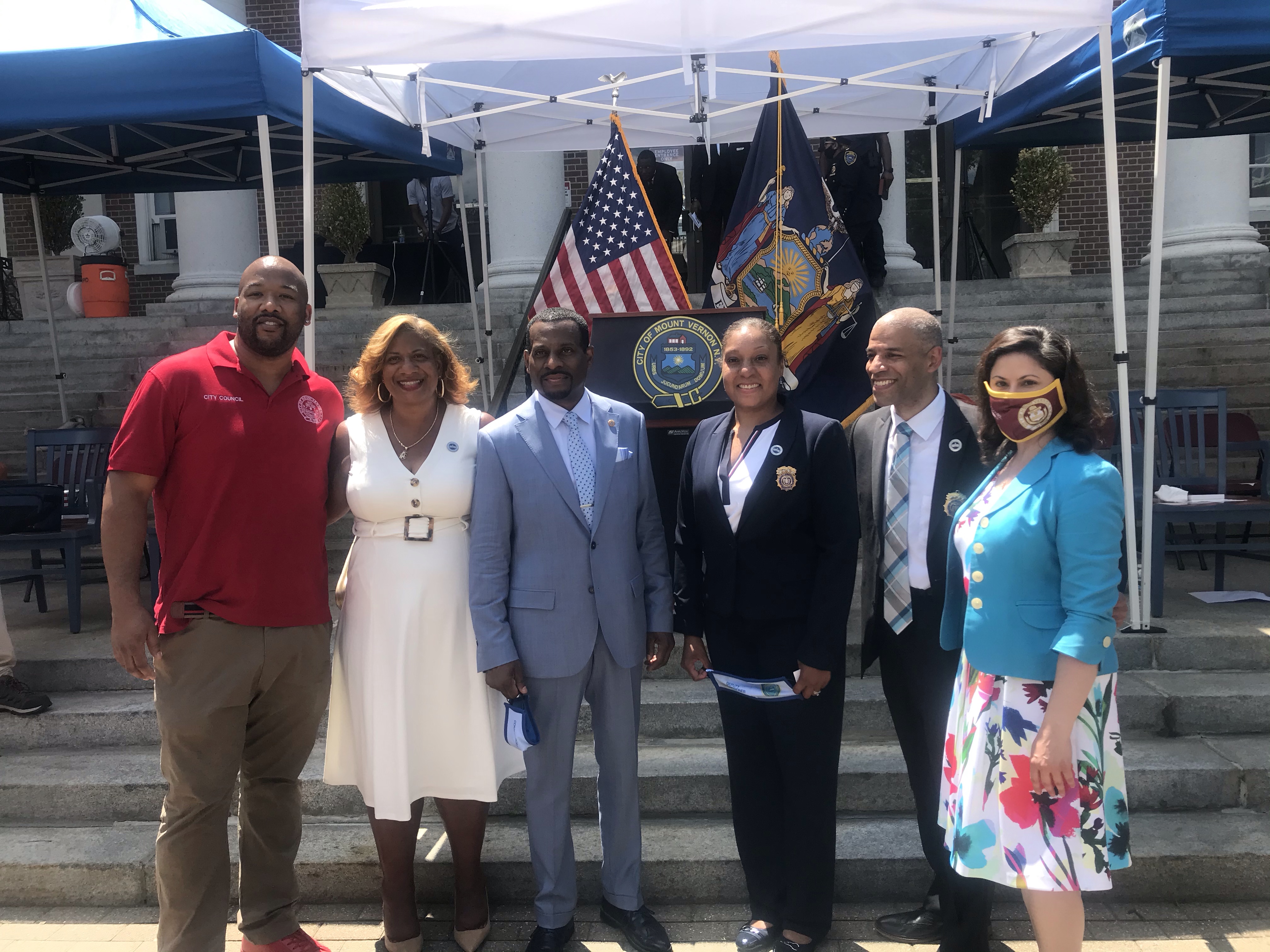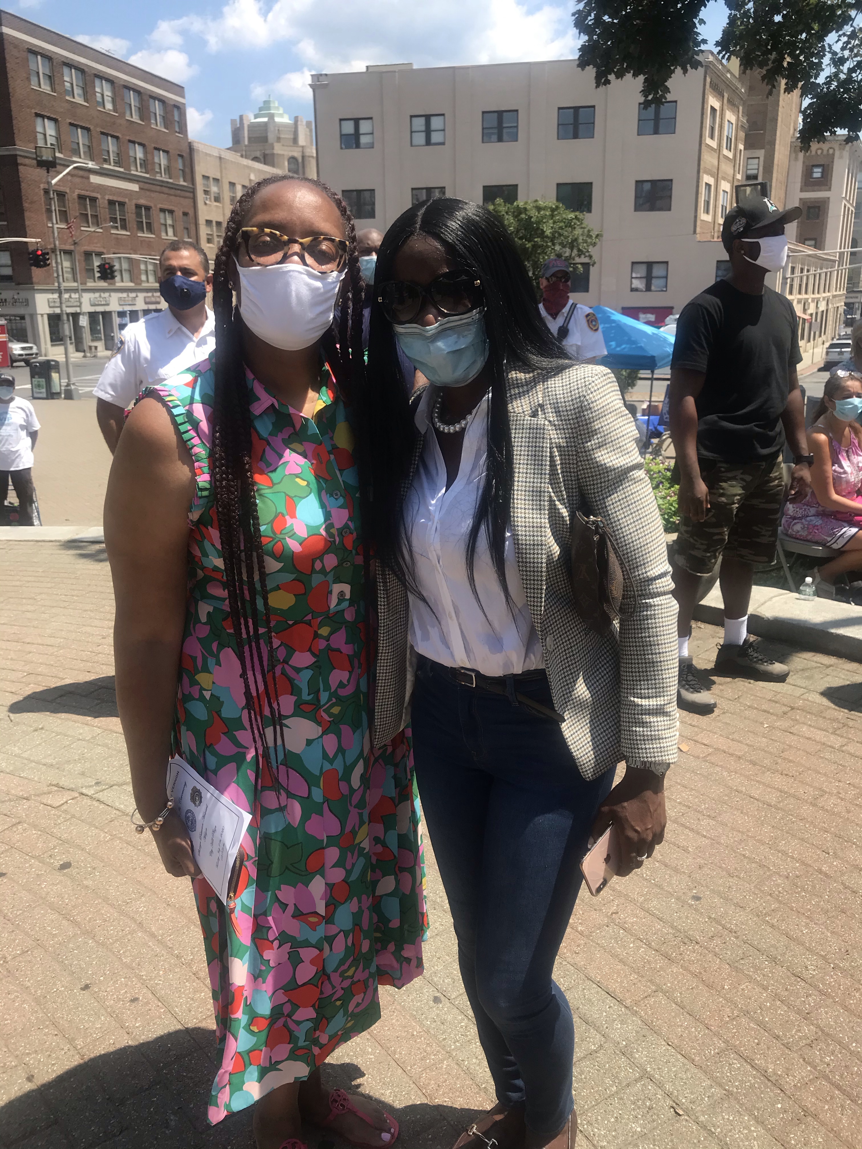 Cynthia Turnquest-Jones, Tha BUMP [left] Priscilla Echi, Social Butterfly [right] congratulates Jennifer Lackard [middle] who was sworn in as Deputy Police Commisioner of Special Initiatives in Mount Vernon, New York today July 21, 2020.