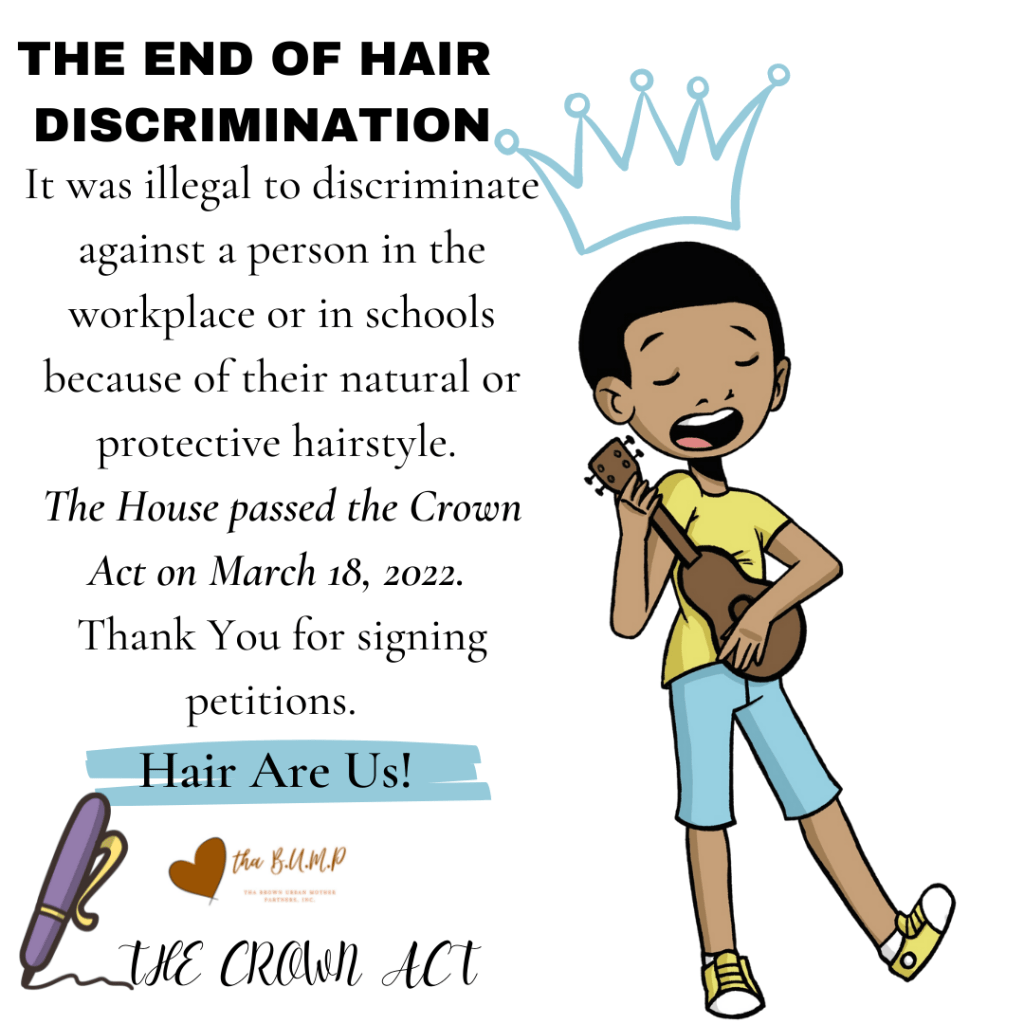 C.R.O.W.N stands for Creating a Respectful and Open World for Natural Hair, and the act prohibits “discrimination based on an individual’s texture or style of hair.”