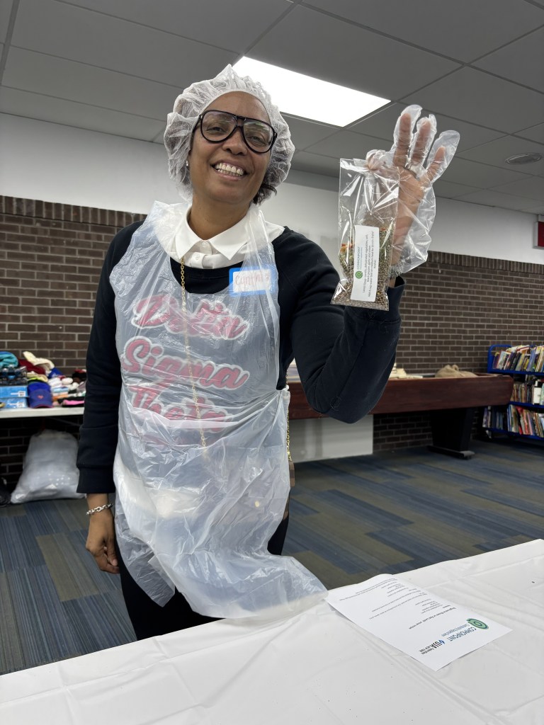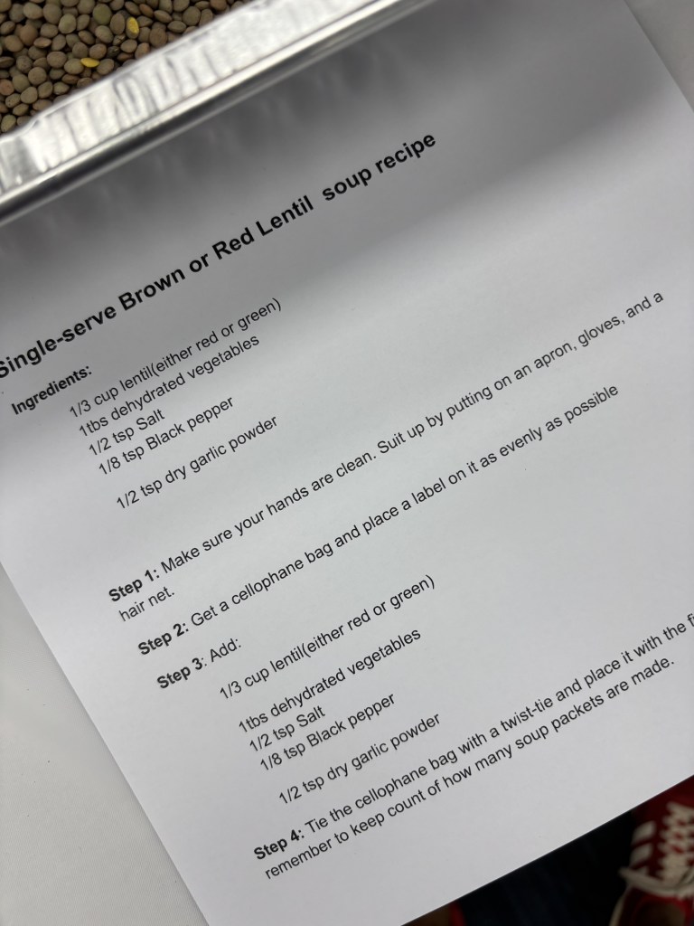 The Lentil Soup section was remarkably efficient, resembling an assembly line. Measuring cups, spoons, labels, bags, gloves, and various pans of ingredients such as lentils, dried vegetables, salt, pepper, garlic, and onions were readily available. A specific procedure was outlined, and I was initially scheduled to switch after 15 minutes. However, I inadvertently became the supervisor of the Lentil Soup Assembly Line. The bags were intended for distribution to individuals in need. To prepare the soup, one simply needed to combine lentil soup with four cups of boiling water. I envisioned myself preparing and enjoying this soup in my thermos while reading a book. However, I also considered the plight of someone experiencing coldness and the need for shelter. Perhaps I could distribute the bags at the bus terminal, or individuals could heat water in their sole pot, add the lentil soup mix, and sip from a borrowed mug.